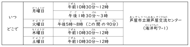 【受講可否の連絡】 5月5日(火)までにメールにてお知らせします。連絡がない場合は、潮芦屋交流センターまでお問い合わせ下さい。