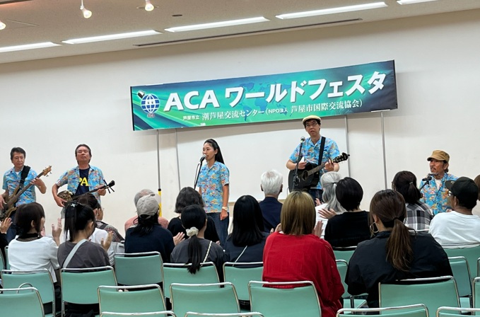 最初に芦屋市・モンテベロ市学生親善使節4名からの挨拶があり、コンサートに移りました。フラダンスの皆さんは台風の交通機関への影響もあり、途中で退場されました。バンドの演奏と歌だけとなりましたが、来場された70名の皆さんのほとんどは最後まで聞いて下さいました。