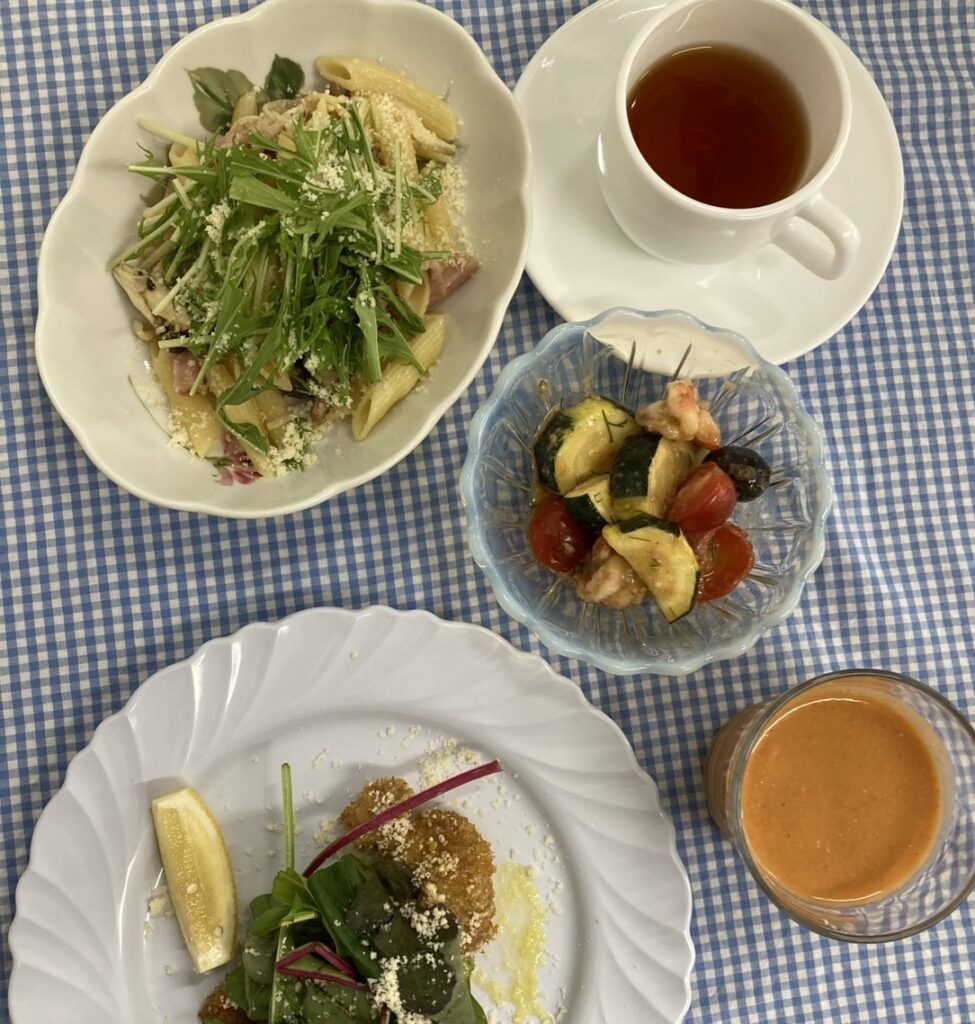 メニューは、タコのブルスケッタ、玉ねぎと焼き茄子の冷製ポタージュ、オクラとプチトマトの冷製カルボナーラ、大葉のグラニテの5品。