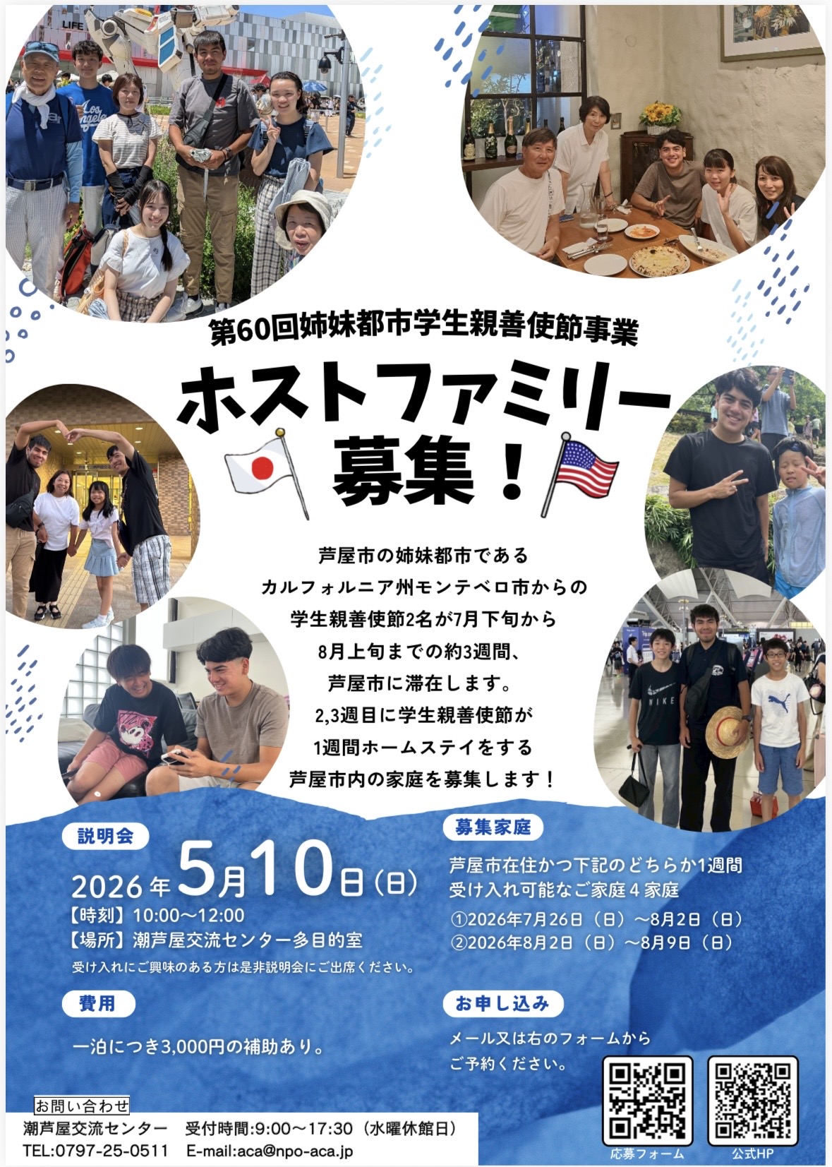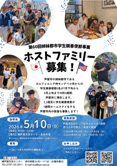 〈募集内容〉 米国カリフォルニア州モンテベロ市からの学生親善使節(SA)2人が、7月19日から8月9日までの約3週間、芦屋市に滞在します。第2週目と3週目にSA1名ずつが約1週間のホームステイをする芦屋市内の家庭を募集します。